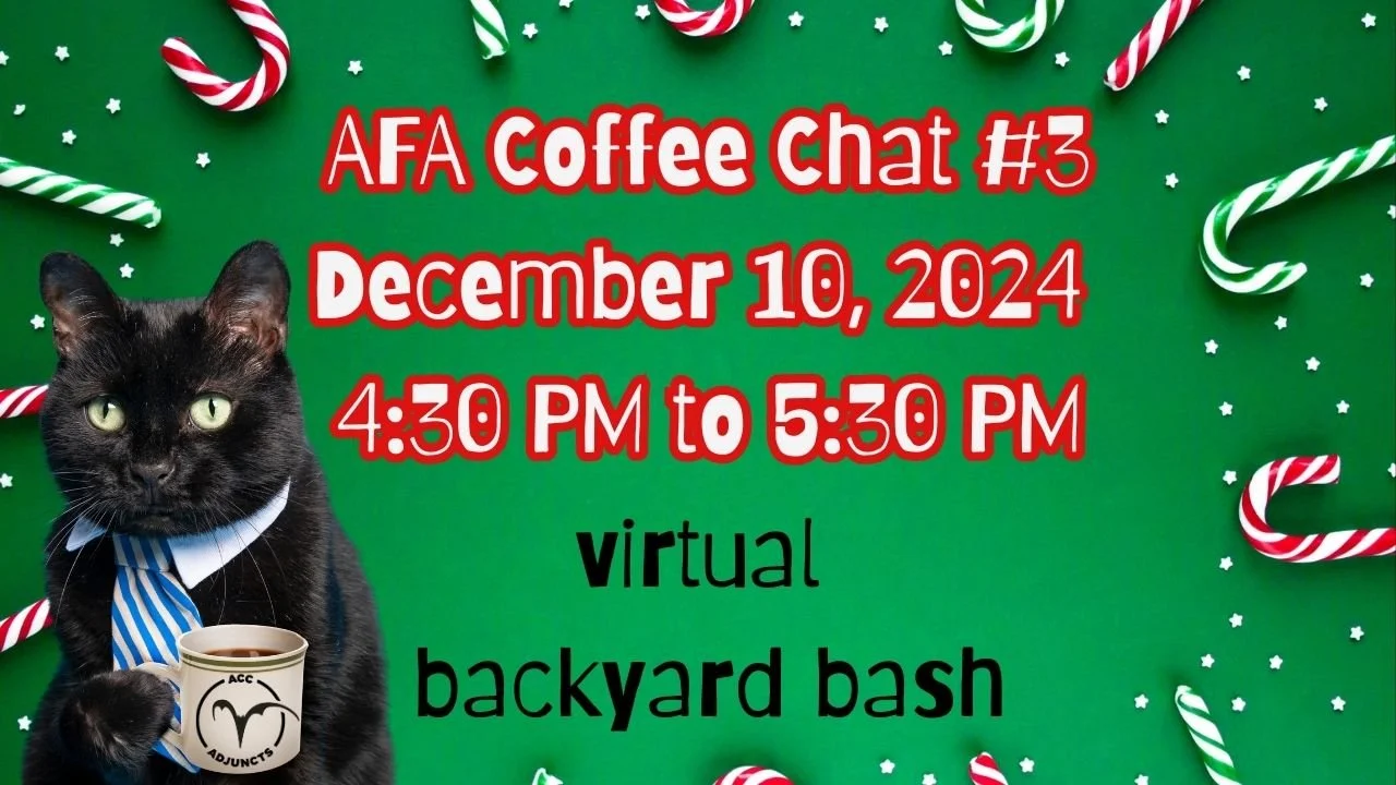 AFA Coffee Chat #3 Virtual Backyard Bash (December 2024): This online gathering offered a unique opportunity to connect with fellow adjuncts, share our experiences, discuss successes, and voice any concerns as the semester came to a close. We brought our favorite beverage and settled into our virtual backyard for a friendly chat. We celebrated our achievements, supported one another, and fostered community before the break.