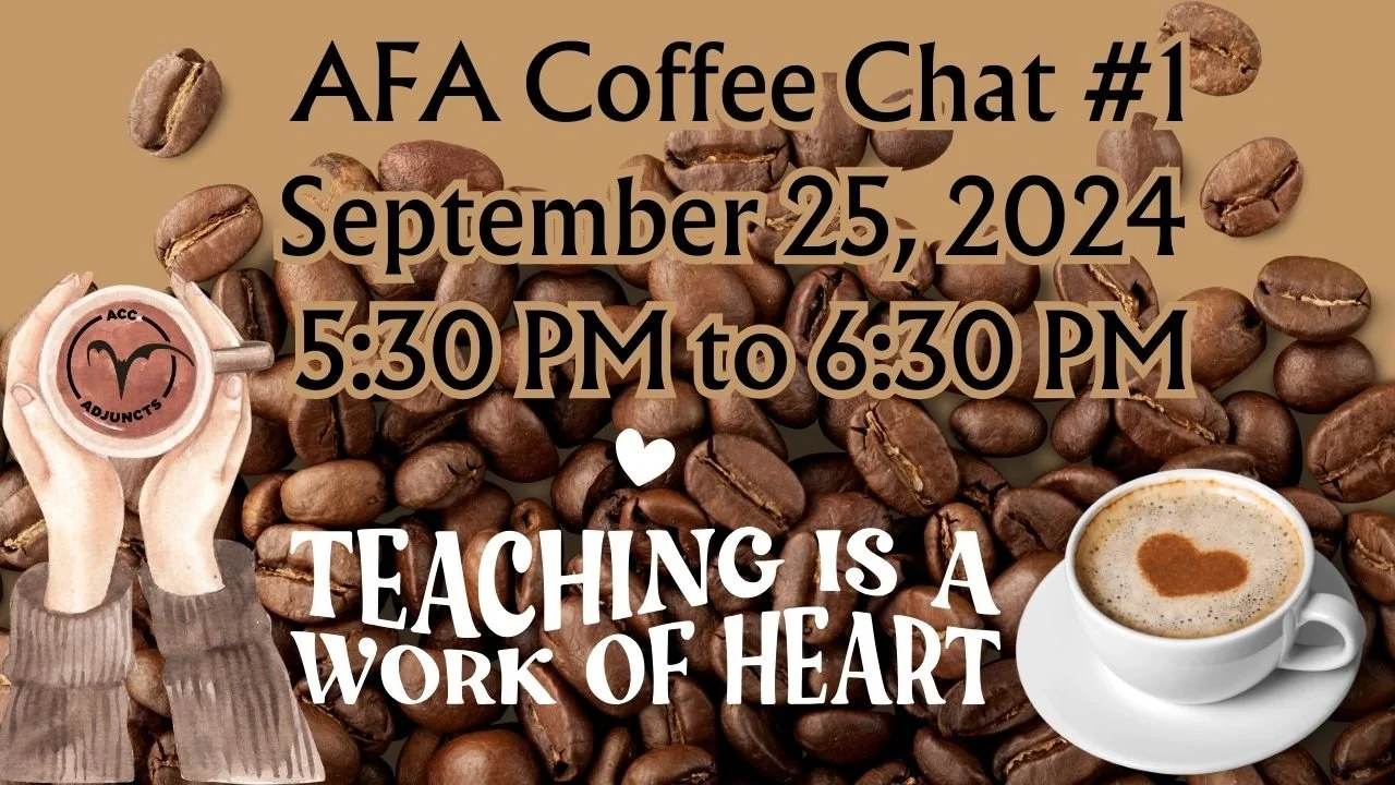 AFA Coffee Chat #1 (September 2024): This virtual event was a great opportunity for adjunct faculty to gather virtually to discuss their concerns and share experiences in a supportive environment. These engaging chats foster open communication and community among adjuncts.
